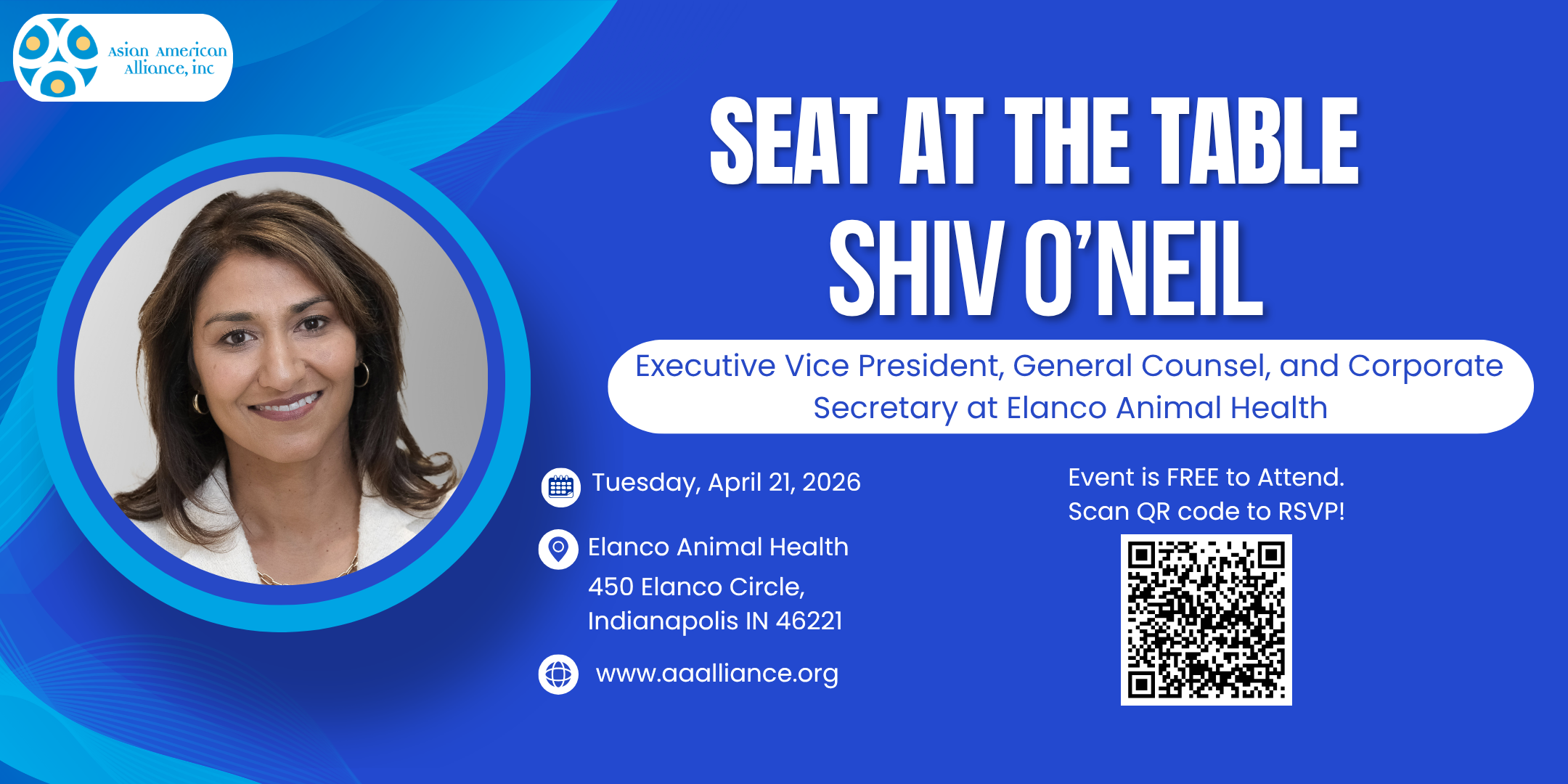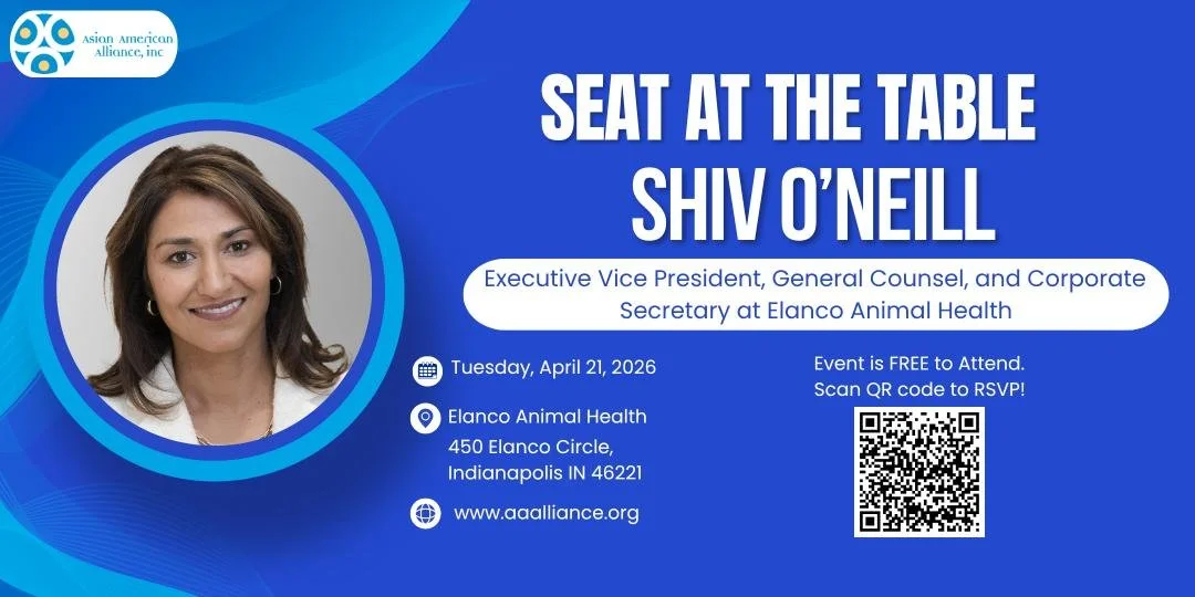 Join us for an inspiring evening hosted by the Asian American Alliance Inc., featuring Shiv O’Neill, Executive Vice President, General Counsel, and Corporate Secretary at Elanco Animal Health. This special gathering offers a unique opportunity to engage in meaningful conversations with a distinguished leader in global business, law, and corporate governance, while celebrating cross-cultural connections within our community.